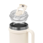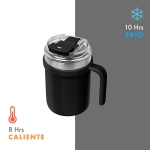 Doble pared. Cerrado al vacío. Pared interna y externa de acero inoxidable. Terminado mate. Incluye tapa con cierre de rosca que ofrece dos alternativas de uso, sobretapa con sistema push y popote con aditamento para cerrar y evitar derrames. Mantiene temperatura caliente 8 hrs y temperatura fría 10 hrs aproximadamente. Capacidad de 18 Oz. Incluye caja individual.