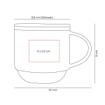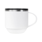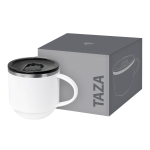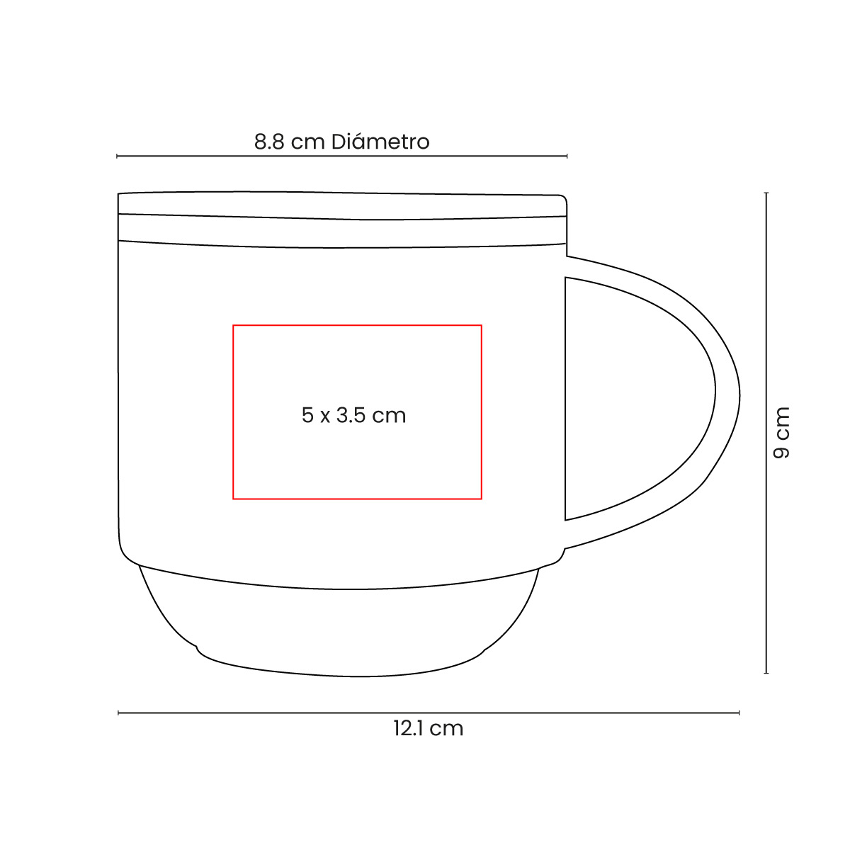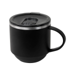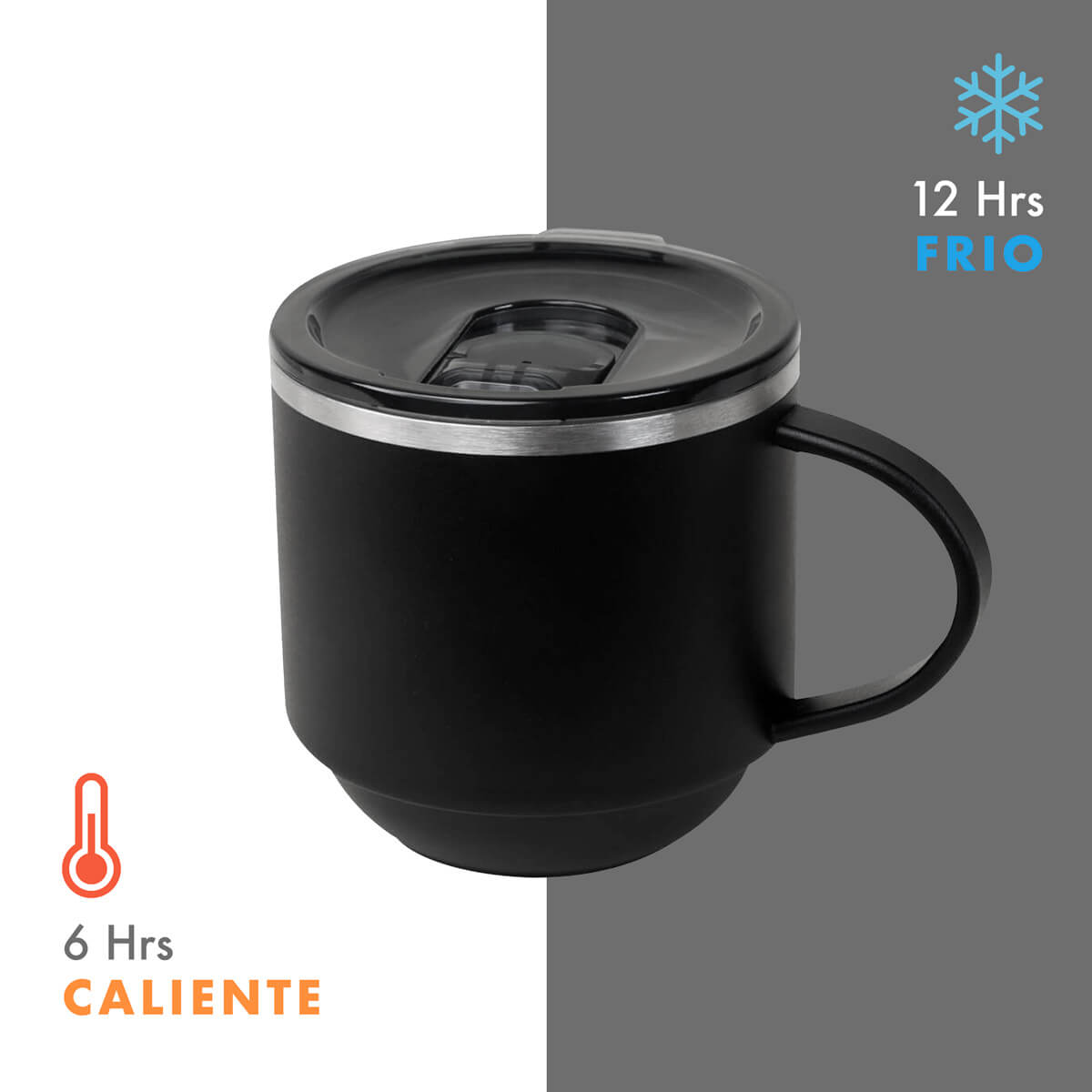 Taza doble pared. Cerrado al vacío. Pared interna y externa de acero inoxidable. Terminado rugoso. Incluye tapa de plástico con sistema push y válvula de seguridad. Mantiene temperatura caliente 6 hrs y temperatura fría 12 hrs. Incluye caja individual.