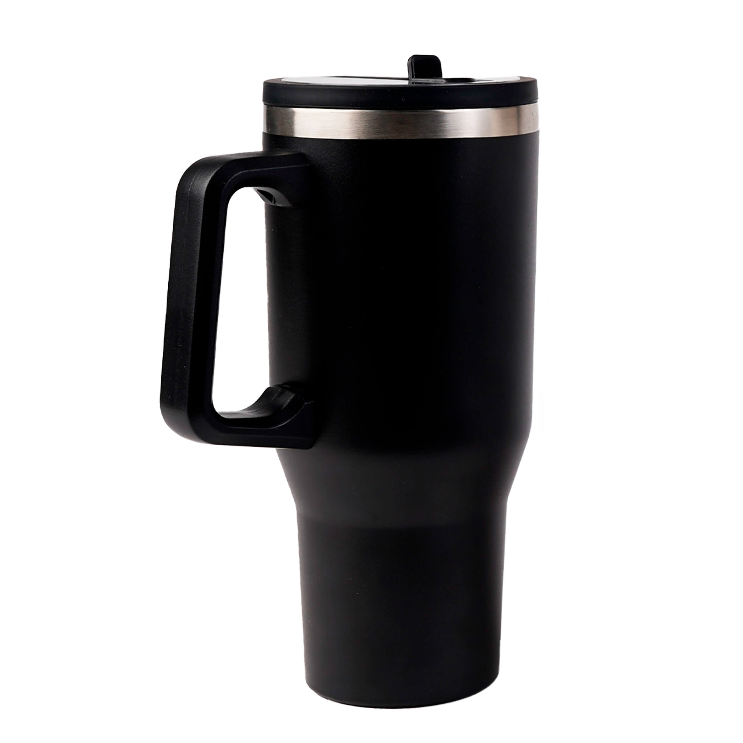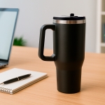 Termo con doble pared de acero inoxidable, insulado al vacio con acabado rugoso. Cuenta con asa lateral, tapa enrosacoble con boquilla abatible y popote