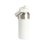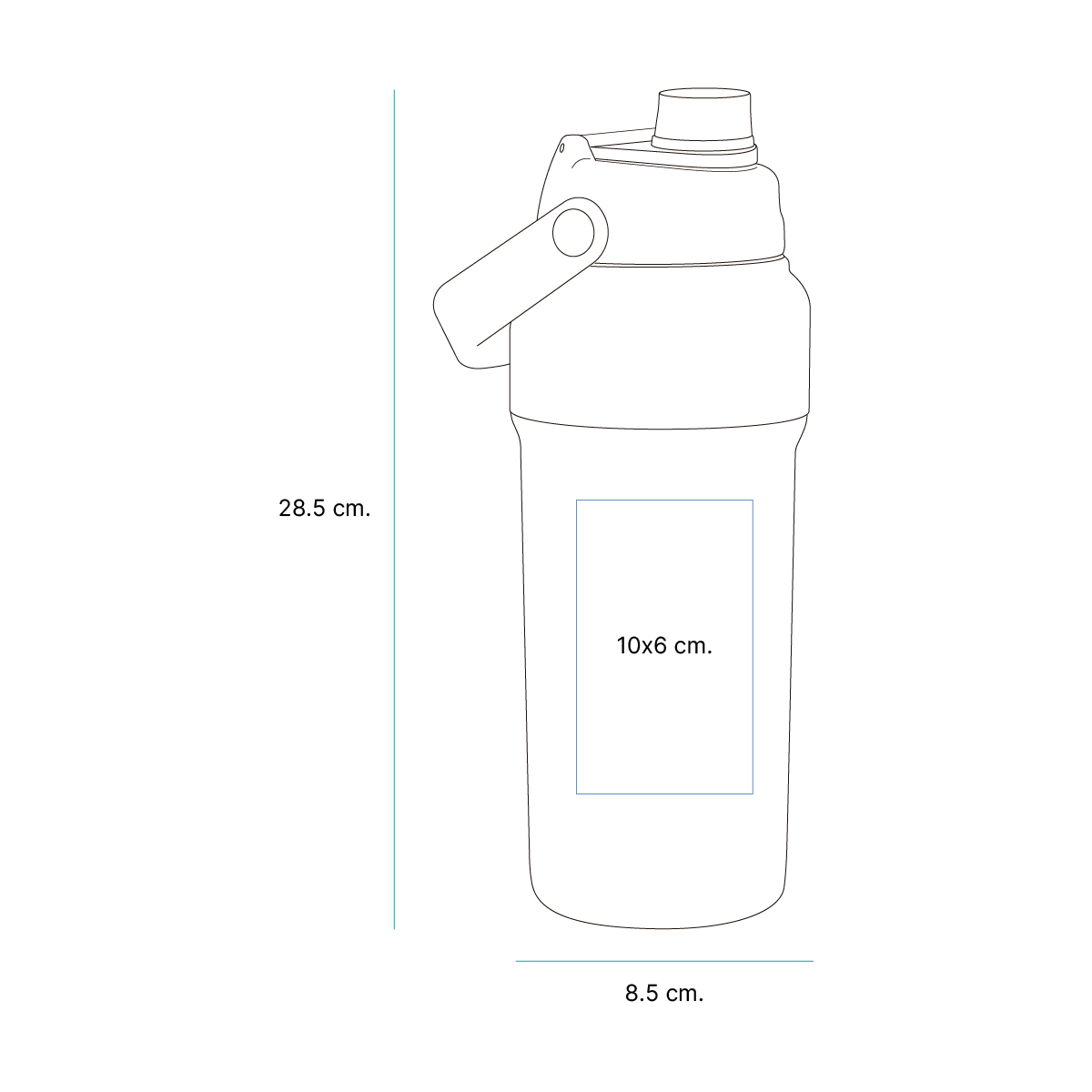 Termo doble pared fabricado en acero inoxidable, tapa de rosca con boquilla, popote interno, agarradera y detalle plateado. Capacidad de 1000 ml.