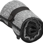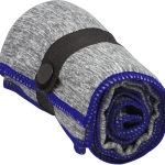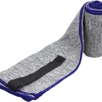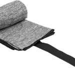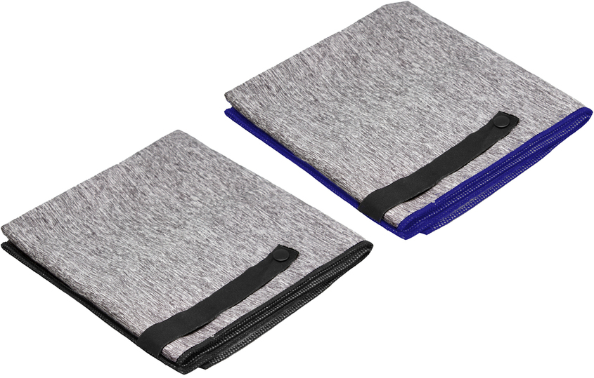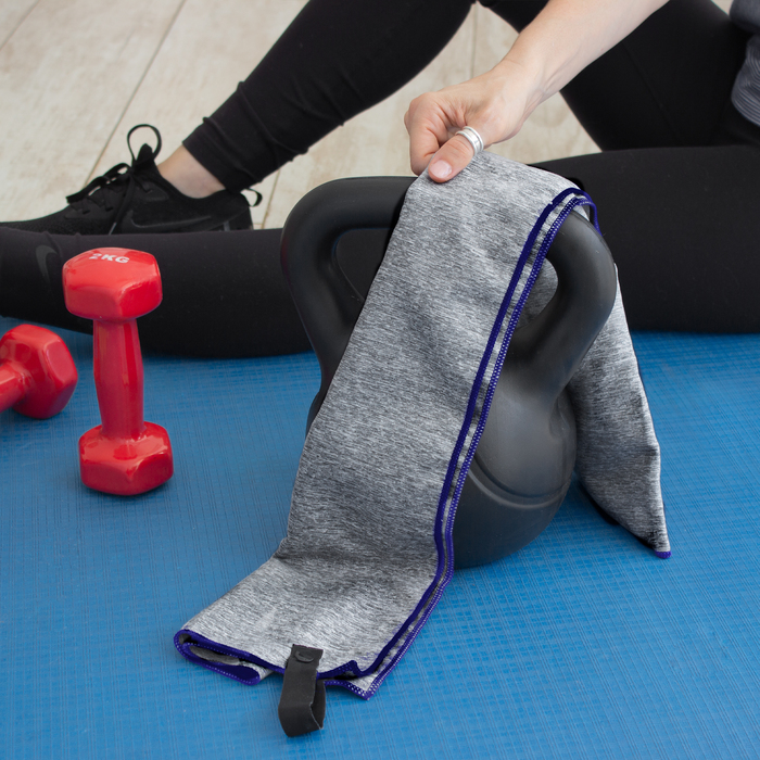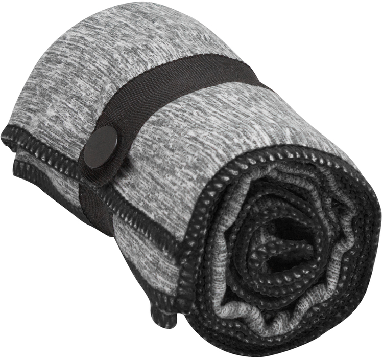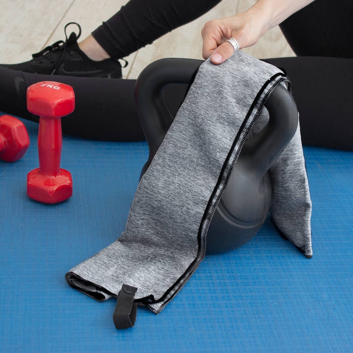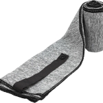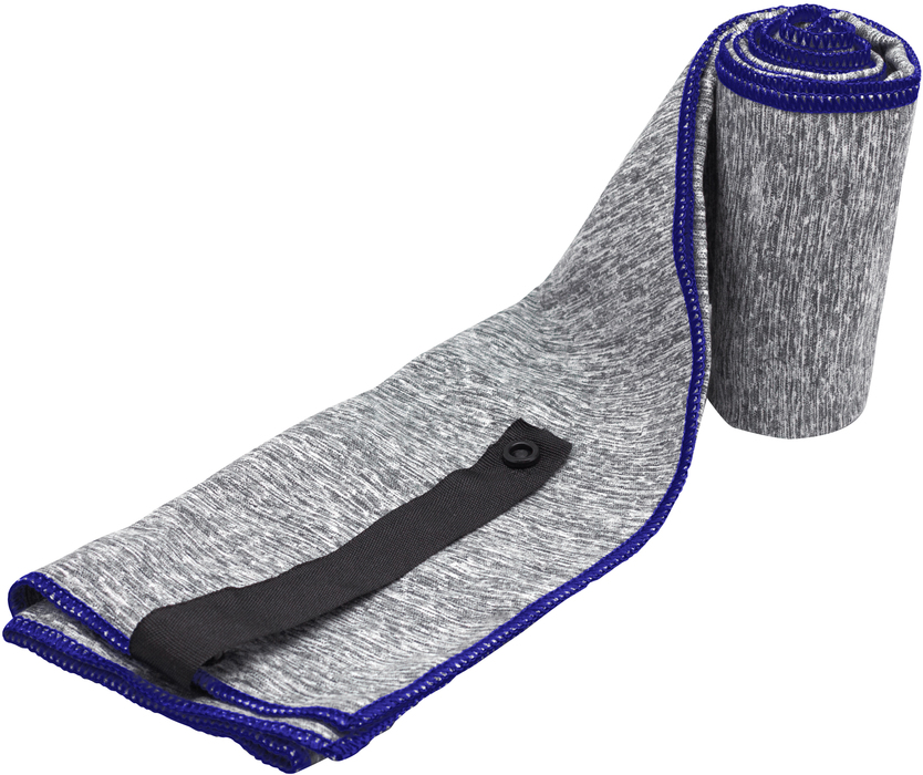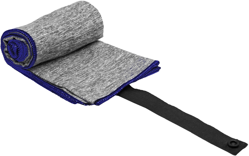 Toalla de microfibra de secado rápido. Poliéster (200 g x m2) catiónico doble cara. Cinta negra que permite enrollar la toalla y aplicar logo.