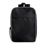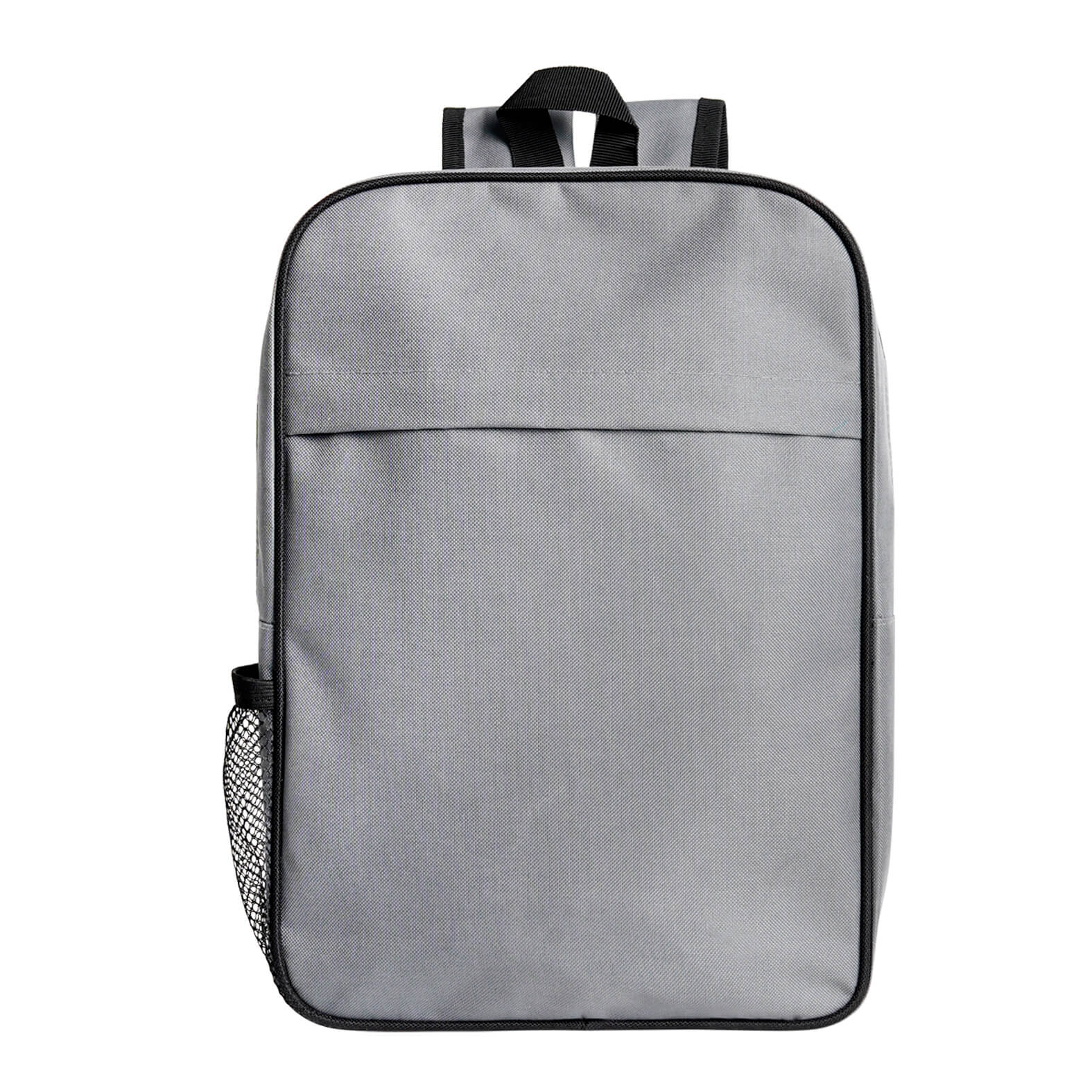 Mochila con compartimento principal, una malla lateral, compartimento frontal con cierre, asa superior y correas ajustables.
