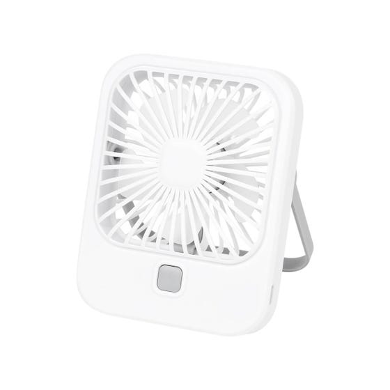 Ventilador portátil. Cuenta con botón de encendido con tres niveles de velocidad, ideal para ajustar el flujo de aire según tus necesidades. Incluye bateria recargable de 500 mAh, permitendo utilizarlo sin necesidad de estar conectado, ideal para llevarlo al lugar que necesites. La base permite girar fácilmente el ventilador para colocarlo en diferentes ángulos. Incluye cable auxiliar con conector tipo C y caja individual.